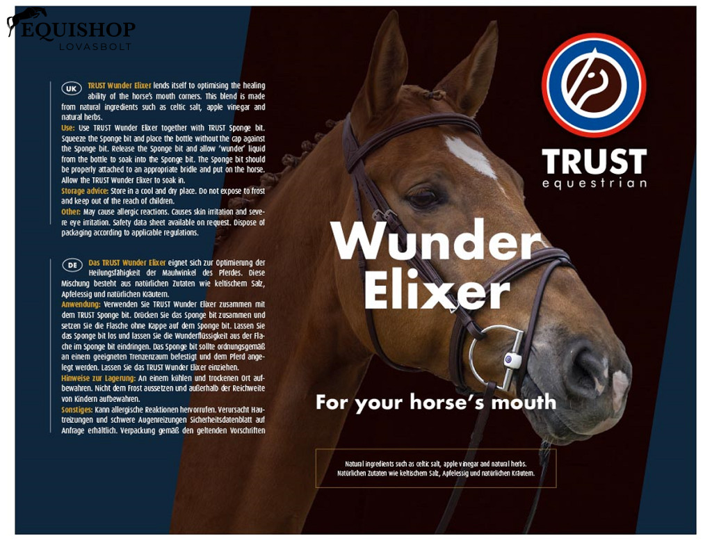 Használat: Használja a TRUST Wunder Elixir-t a TRUST szivacsos zablával együtt. Nyomja össze a szivacsos zablát, és helyezze a kupak nélküli flakont a habszivacs zablára. Engedje el a habszivacs zablát, és hagyja, hogy a flakonból származó „csoda” folyadék beszívódjon a habszivacs zablába. A szivacs zablát megfelelően rögzíteni kell egy megfelelő kötőfékhez/kantárhoz, és fel kell helyezni a lóra. Hagyja, hogy a TRUST Wunder Elixir egy ideig beszívódjon a ló szájába.