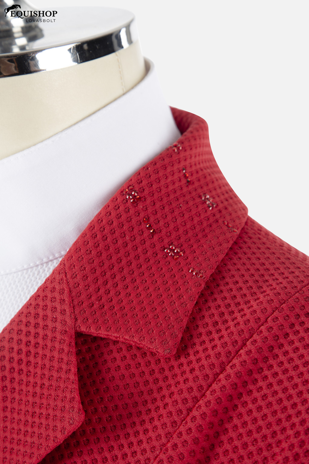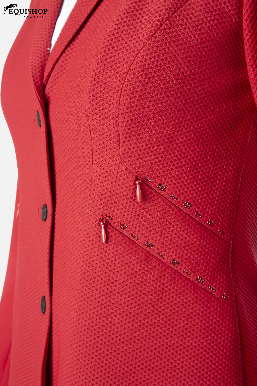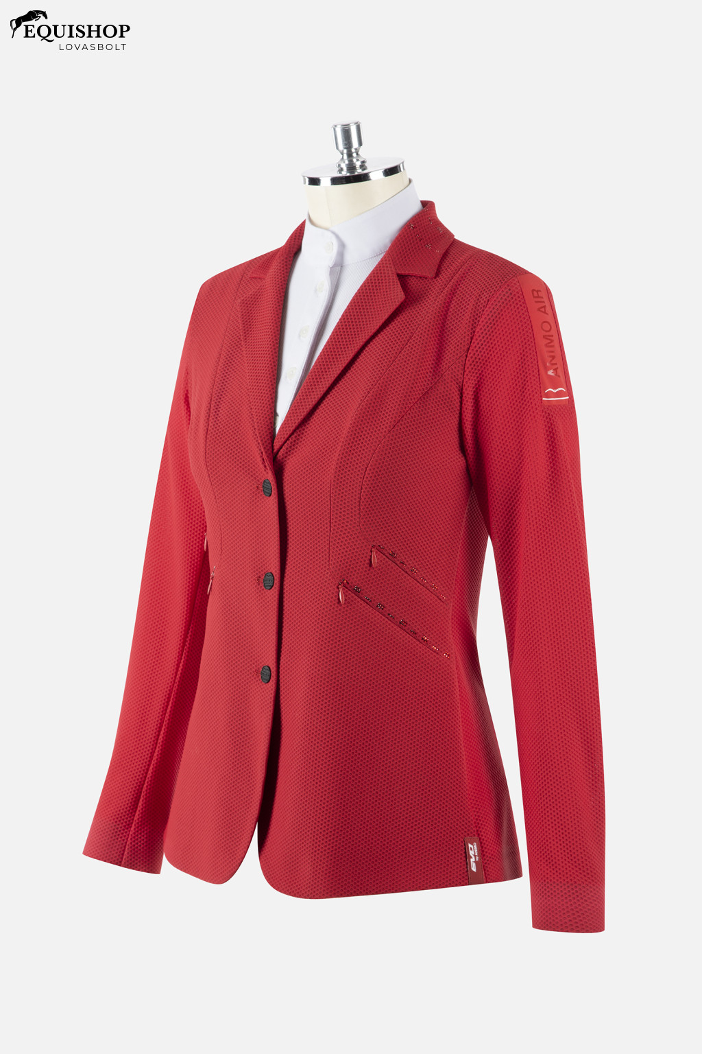 Női extralight versenyzakó hálóból. Belső cipzár és fekete dörzsölés berizált külső gombok. Strasszos alkalmazások a gallérban és felett az oldalsó zsebeken. Betét a bal vállon, kontrasztos anyagból, Animo Air-el nyomtatott és fehér Albatros logó. A „Star” Piquet-tel készült ruhadarabok könnyűek. Kényelem és szabadság a lovas számára, miközben megőrzi a jelentős kompaktságot.