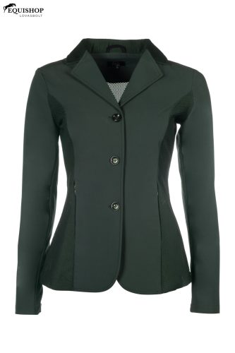 A Hunter Woman versenykabát elegáns, testreszabott szabással és funkcionális részletekkel nyűgöz le a maximális kényelem érdekében. A légáteresztő hálószövetből készült, stratégiailag elhelyezett betétek optimális szellőzést biztosítanak, míg a gombzár mögötti rejtett cipzár tökéletes illeszkedést garantál. Mivel nagyon rövidre van vágva, különösen alkalmas díjugrató versenyekre.
