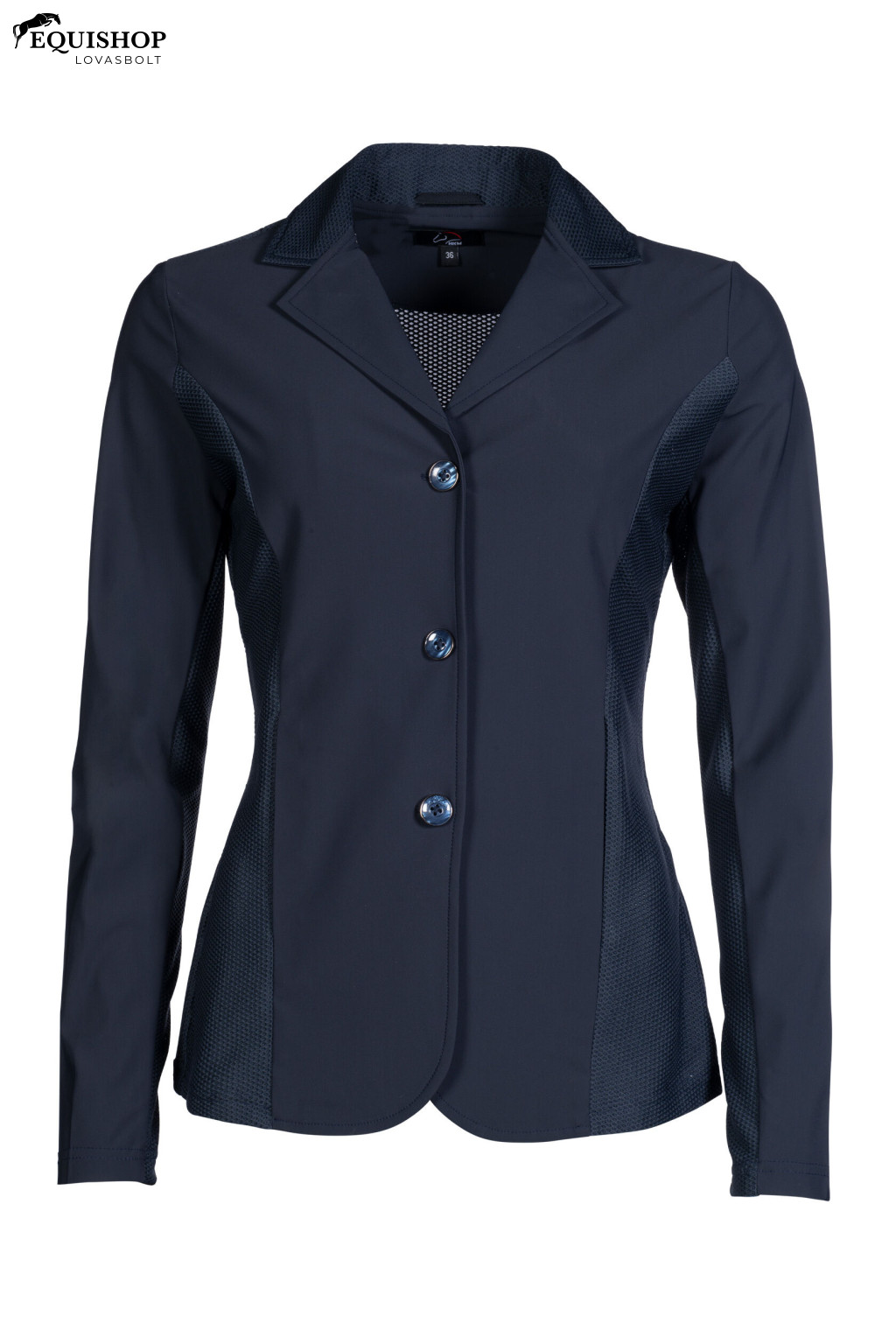 A Hunter Woman versenykabát elegáns, testreszabott szabással és funkcionális részletekkel nyűgöz le a maximális kényelem érdekében. A légáteresztő hálószövetből készült, stratégiailag elhelyezett betétek optimális szellőzést biztosítanak, míg a gombzár mögötti rejtett cipzár tökéletes illeszkedést garantál. Mivel nagyon rövidre van vágva, különösen alkalmas díjugrató versenyekre.