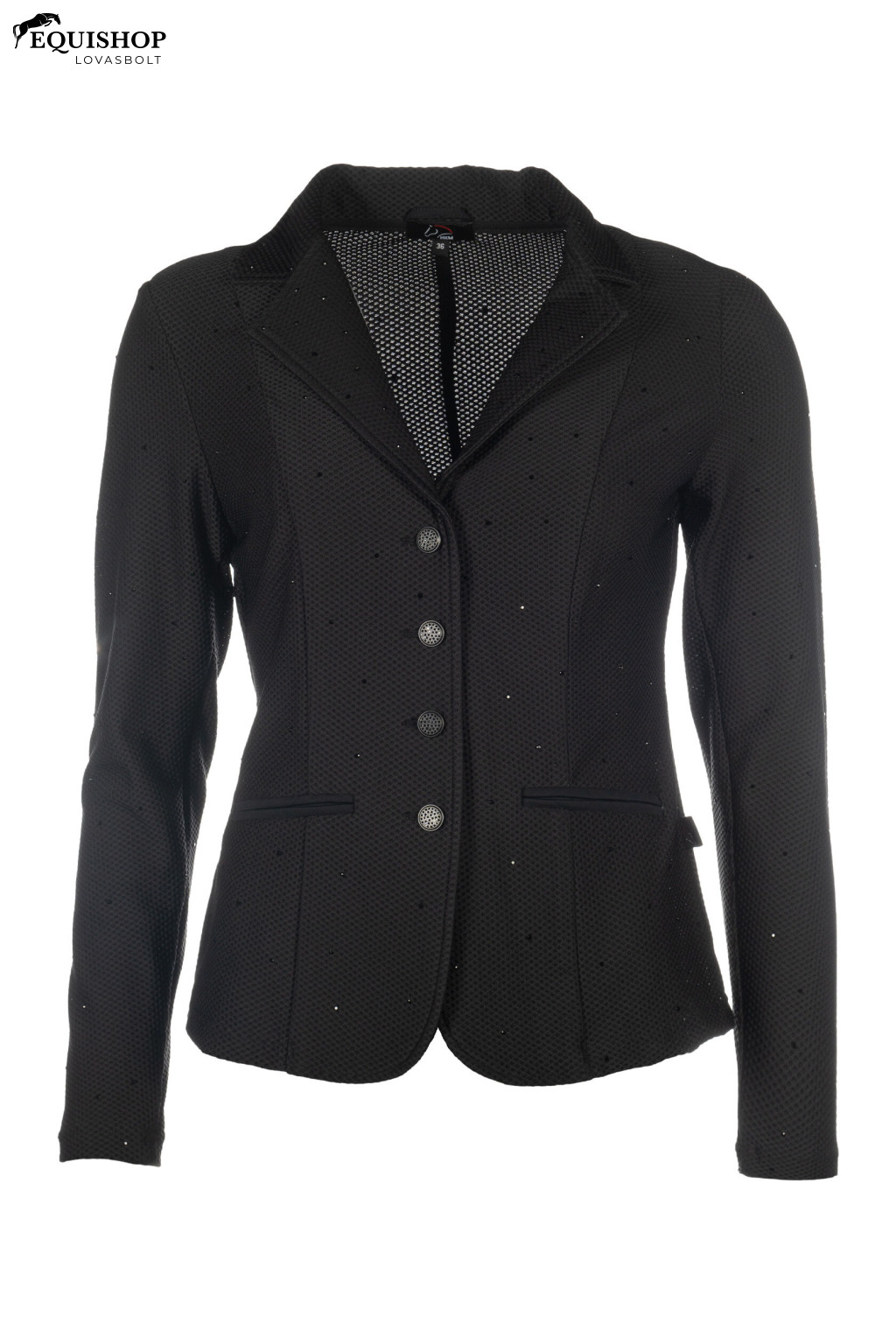 A Crystal versenykabát az eleganciát és a funkcionalitást ötvözi a tökéletes megjelenés érdekében az arénában vagy a pályán. A könnyű hálóból készült, lélegző anyag kényelmes illeszkedést biztosít még melegebb hőmérsékleten is, míg a testreszabott szabás és az integrált lovaglórések optimális mozgásszabadságot biztosítanak. A gombzár mögötti rejtett cipzár és a finom strasszokkal díszített díszítés elegáns megjelenést kölcsönöz a kabátnak. Anyaga gyűrődésálló és rugalmas, ezért tökéletesen alkalmazkodik a test formájához.