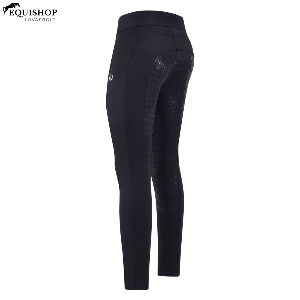 Magas derekú női lovaglónadrág szilikon teljes fogású anyaggal, telefontartó zsebekkel és sikkes rugalmas derékpánttal.
